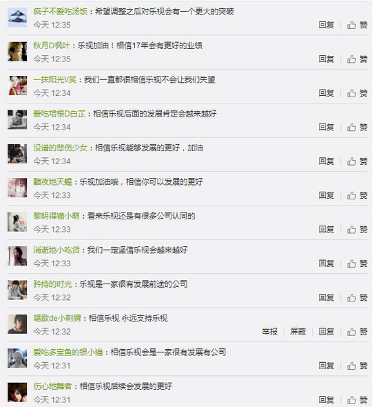 事实上,不仅是海外,乐视在中国也被质疑动用“水军”力量刷评论,包括微博也有不少如下图所示的“力挺”言论。
