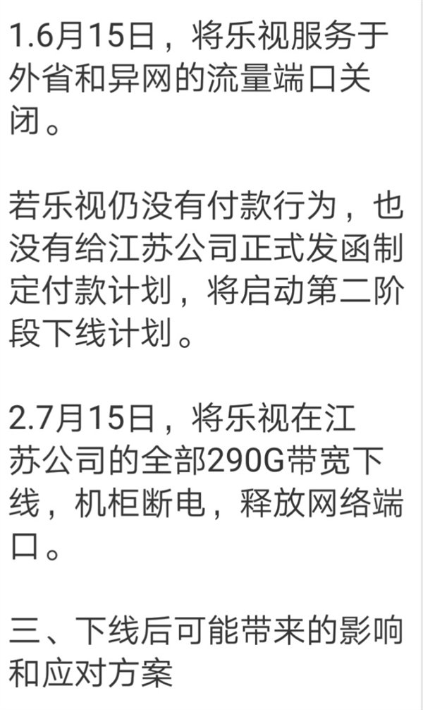 若乐视仍没有付款行为,也没有给江苏公司正式发函制定付款计划,7月15日,将乐视在江苏公司的全部290G带宽下线,机柜断电,释放网络端口