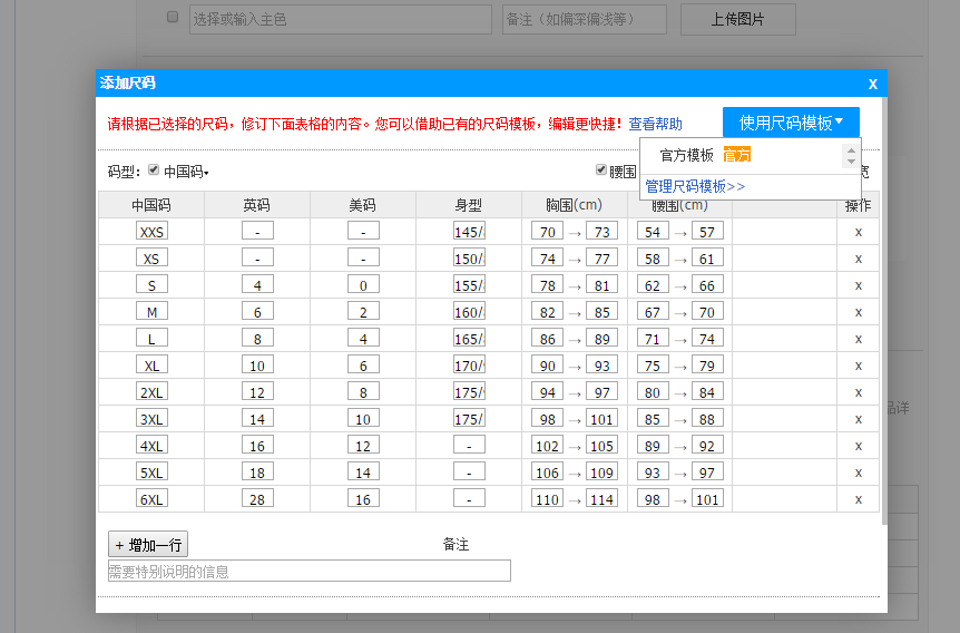 根据产品属性来填写以下内容,注意尺码可以根据自己的要求去自定义设置。也可使用模板